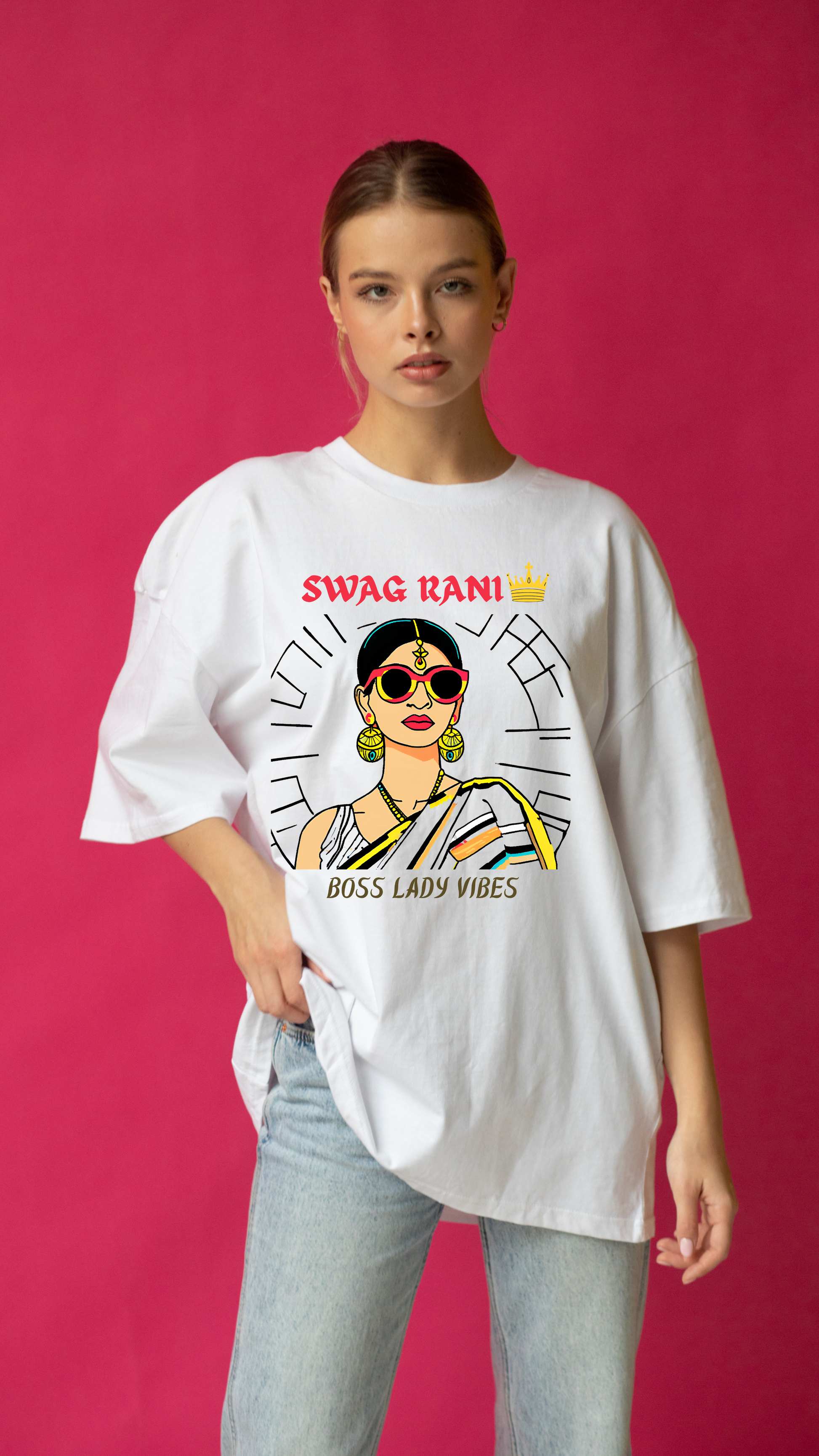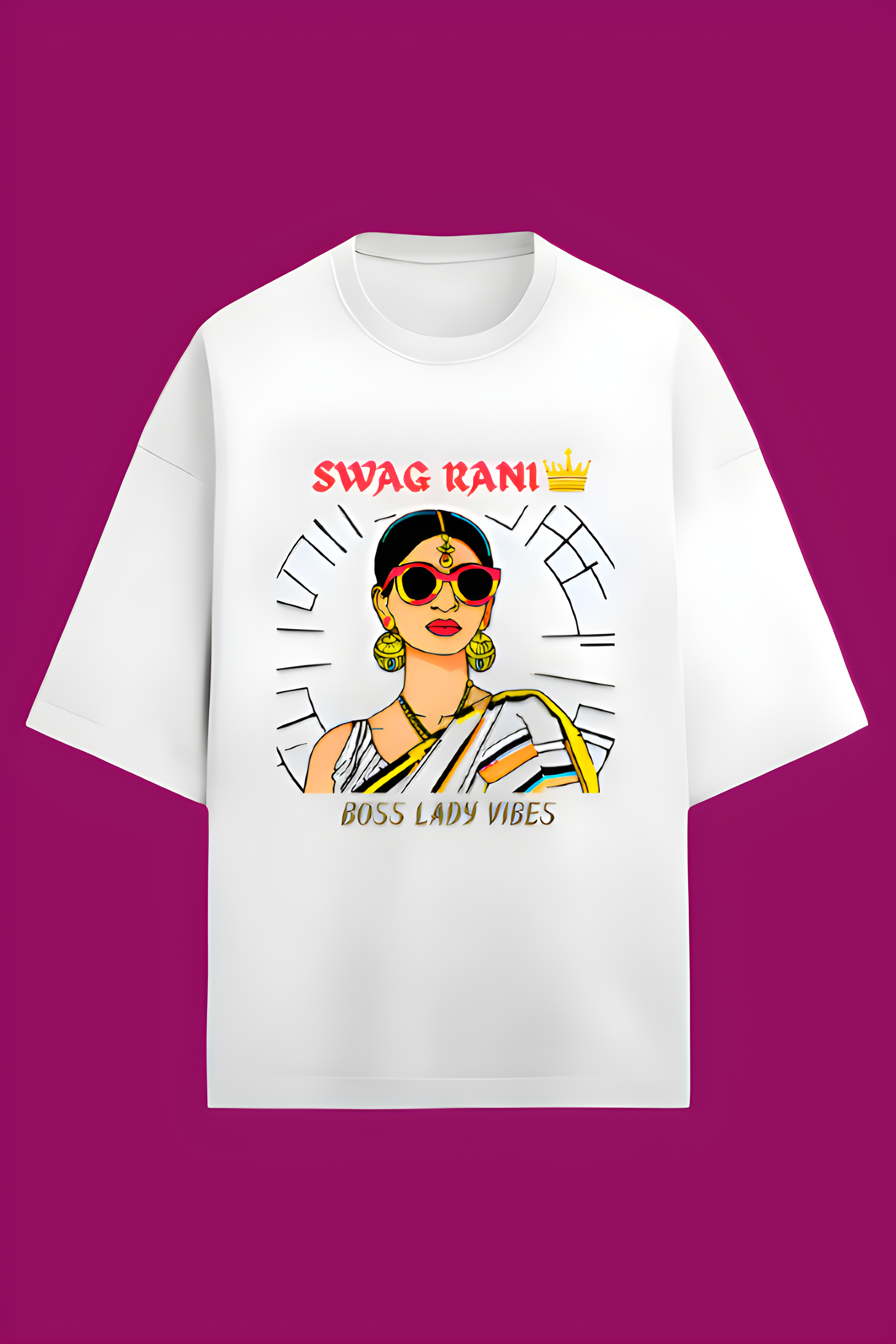 Unleash your inner Boss Lady with this bold and stylish "Swag Rani" oversized T-shirt. Designed for queens who rule their world, this tee blends desi swag with modern fashion. Featuring an aesthetic illustration of a traditional Indian woman rocking sunglasses, this T-shirt is perfect for those who love fusion fashion.